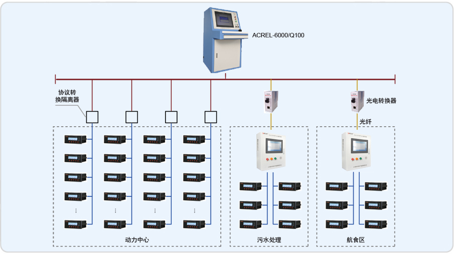 系統采用分層分布式結構,站控管理層及現場設備層,站控管理層設備為我公司一套琴臺式電氣火災監控設備及2套壁掛式電氣火災監控設備,對分散在各區域內的ARCM剩余電流式電氣火災監控裝置進行遙測、遙信,實現監控與管理。各區域內探測器采用RS485總線直接接入琴臺式電氣火災監控設備。系統采用Acrel-6000電氣火災監控系統,實現對被保護電氣線路的實時監測。