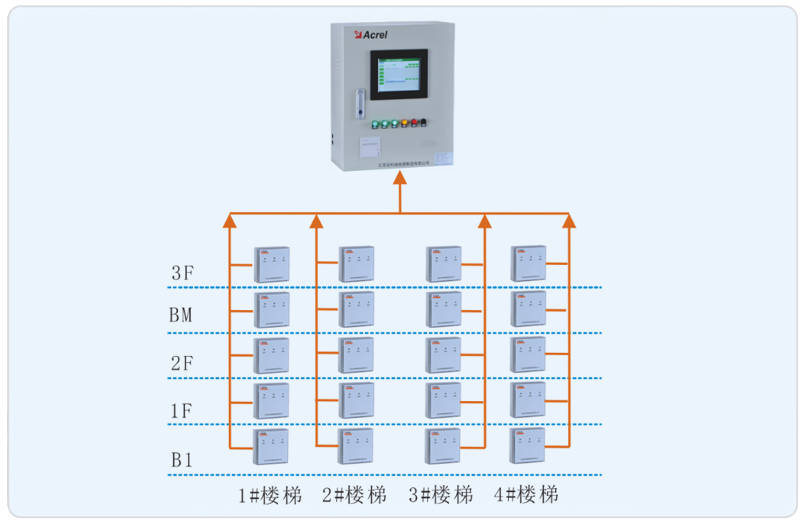 系統(tǒng)采用安科瑞防火門監(jiān)控系統(tǒng),該系統(tǒng)主要采用分層分布式網(wǎng)絡(luò)結(jié)構(gòu),系統(tǒng)結(jié)構(gòu)為:站控管理層、網(wǎng)絡(luò)通訊層和現(xiàn)場設(shè)備層。其中黃巖博物館項(xiàng)目現(xiàn)場設(shè)備分布為B1至3F常閉防火門。該系統(tǒng)監(jiān)控所有樓道內(nèi)的常閉防火門且實(shí)時監(jiān)測防火門狀態(tài),如有異常會后臺報(bào)警。所有監(jiān)測模塊通過二總線鋪設(shè)至消防控制室,防火門監(jiān)控主機(jī)從而完成對監(jiān)測模塊的采集并監(jiān)控。