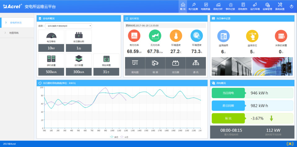 顯示所關注變電所的基本信息(電壓等級、變壓器臺數、裝機容量、運行容量)、運行狀態(功率、環境溫濕度等)、事件信息(遙信事件、遙測事件)、當日用能情況(逐時用能趨勢、環比用能情況)。