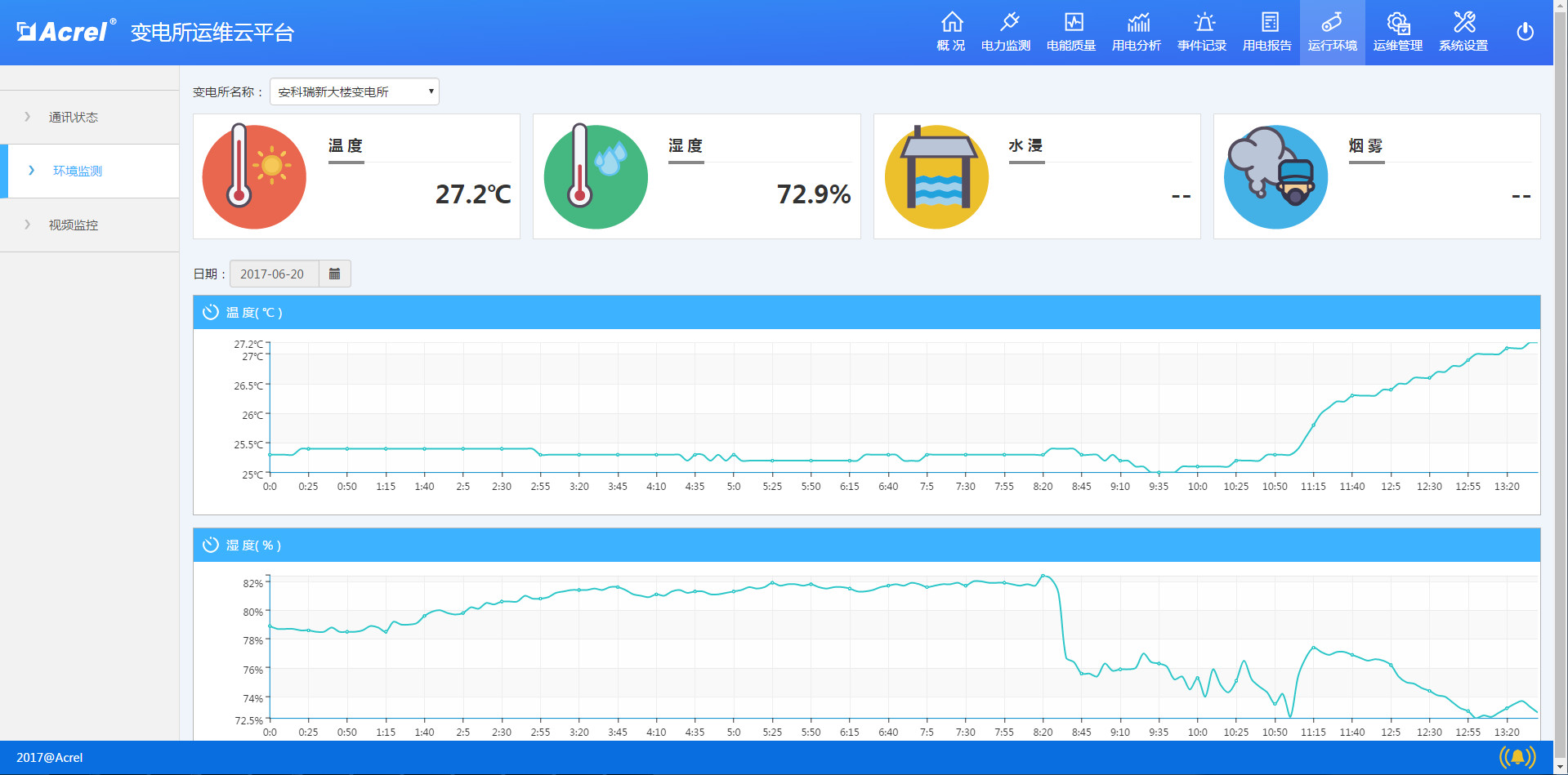 顯示某個變電所的儀表通訊狀態、環境信息(溫度、濕度、水浸、煙霧等)、視頻信息等。