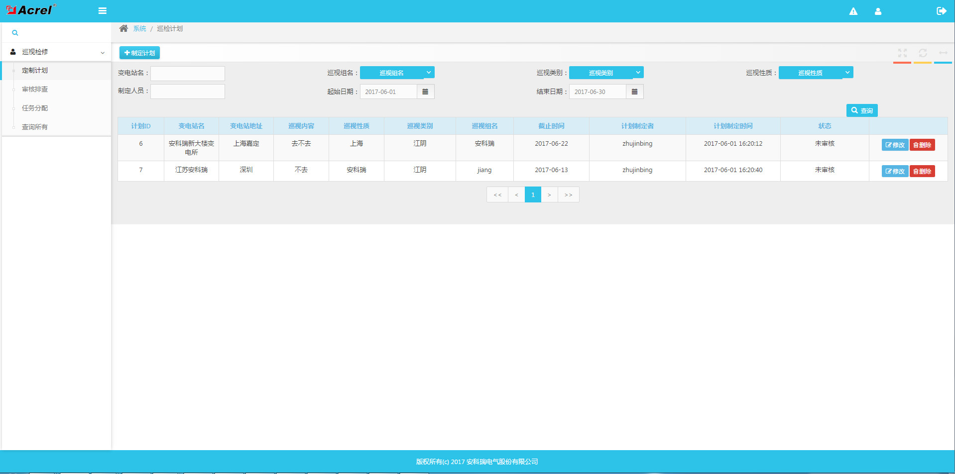 提供巡檢計劃編制,經審核后生成巡檢任務推送到巡檢人員的手機上,巡檢人員執行巡檢任務并登記巡檢內容;平臺可提供數據,供運維參考,為巡檢提供便利。